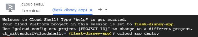 When app files are ready and uploaded on Google App Engine, we can deploy our application. Note that you can select or change your cloud project using gcloud config set project [name_of_your_project]. In order to deploy your application just type: gcloud app deploy.