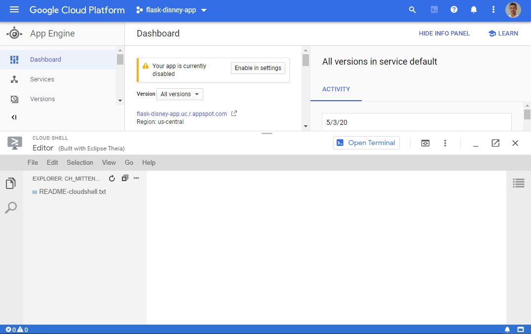 Now go to Navigation Bar and select Google App Engine Dashboard which is located in the 'Compute Section' and work yourself through the 'get started guide' of App Engine. Once done, activate Cloud Shell to enter the Terminal. Alternatively, you can later use either Cloud Shell or the Cloud SDK to deploy your application.